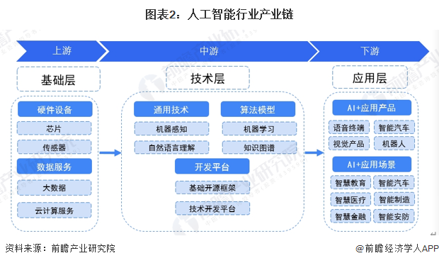 人工智能產(chǎn)業(yè)鏈上游為硬件設(shè)備和數(shù)據(jù)設(shè)備,其中包括芯片、傳感器、大數(shù)據(jù)、云計算服務(wù)等,為人工智能提供數(shù)據(jù)服務(wù)和算力支持;中游是人工智能產(chǎn)業(yè)的技術(shù)核心,包括通用技術(shù)、算法模型、開發(fā)平臺三個方面,涵蓋了機(jī)器感知、自然語言理解、機(jī)器學(xué)習(xí)、圖譜、基礎(chǔ)開源框架等核心技術(shù);下游是人工智能的應(yīng)用產(chǎn)品和場景,涉及交通、醫(yī)療、安防、金融、家居、制造等多個領(lǐng)域。