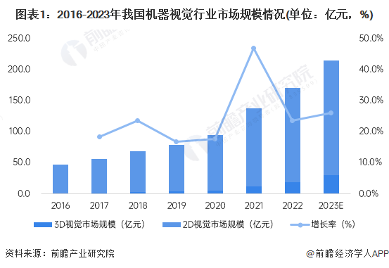 近年來(lái),物流倉(cāng)儲(chǔ)、新能源行業(yè)的蓬勃發(fā)展拉動(dòng)了相關(guān)企業(yè)的擴(kuò)產(chǎn)需求,視覺(jué)檢測(cè)產(chǎn)品需求增長(zhǎng)明顯。2022年中國(guó)機(jī)器視覺(jué)市場(chǎng)規(guī)模為170.5億元(該數(shù)據(jù)未包含自動(dòng)化集成設(shè)備規(guī)模),同比增長(zhǎng)23.6%。其中,2D視覺(jué)市場(chǎng)規(guī)模約為152.0億元,3D視覺(jué)市場(chǎng)約為18.5億元。前瞻初步測(cè)算,2023年我國(guó)機(jī)器視覺(jué)市場(chǎng)規(guī)模達(dá)到215億元左右。