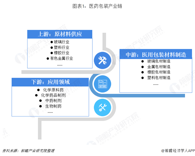 從產業鏈角度來看,目前醫藥包裝的上游原材料行業主要包括有色金屬、玻璃、塑料、橡膠、造紙等行業;對醫藥包裝業有需求的下游產業主要有化學原料藥、化學藥品制劑、中成藥、生物制藥等制藥行業。