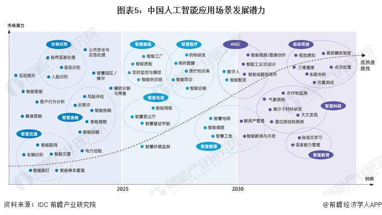 根據IDC和浪潮信息聯合發布的《2022-2023年中國人工智能計算力發展評估報告》,人工智能市場有巨大發展潛力。當前,生物識別、智慧金融等領域應用較為成熟。2025-2030年,智能制造、智慧醫療和智慧電信將會是發展潛力較大的領域。長遠來看,AIGC和自動駕駛將是最具發展潛力的應用場景。