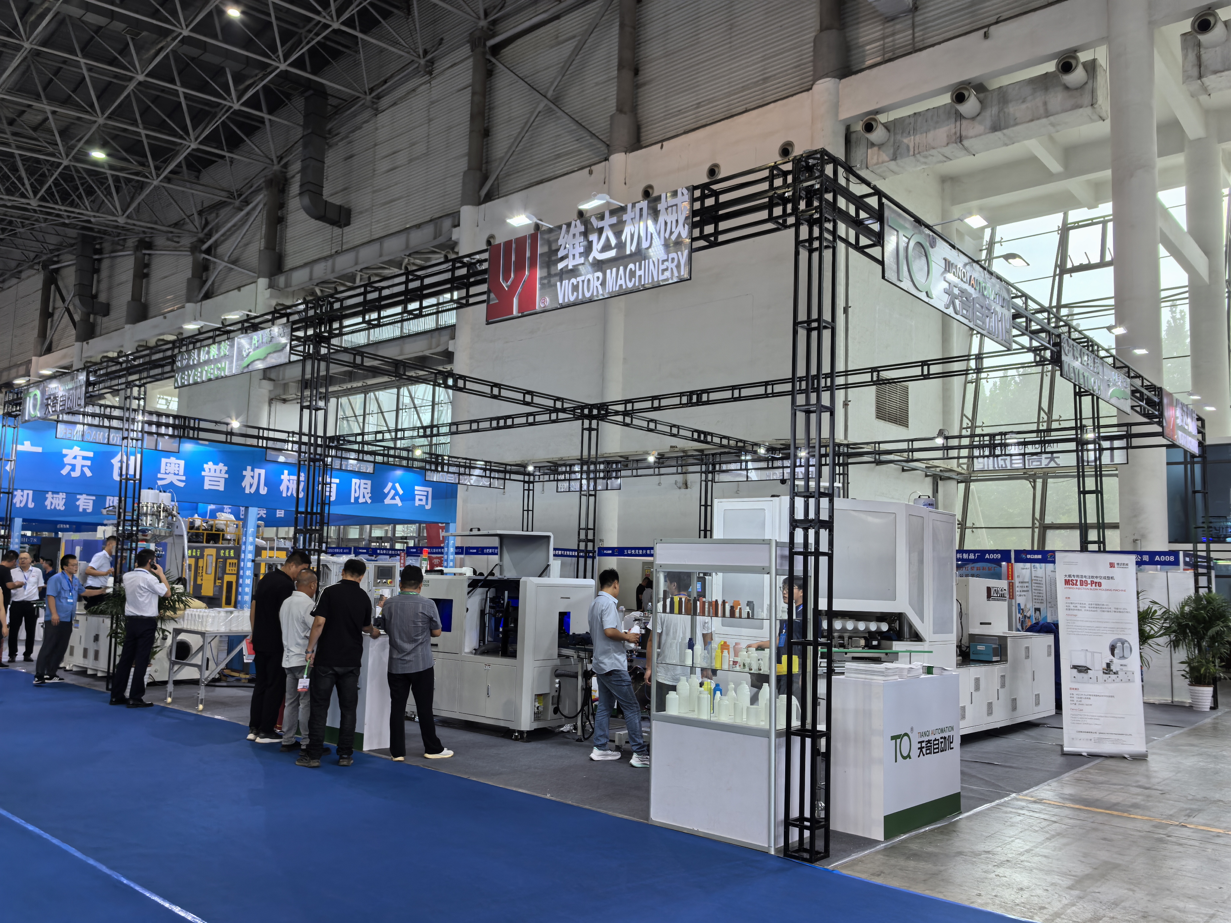 展會現(xiàn)場,維達機械、科億科技、天奇自動化三家設(shè)備連線動態(tài)運行,全場景展現(xiàn)1出6腔大瓶專用混電注吹中空成型機、高速測漏機、AI全自動瓶子檢測機、打包機,以動態(tài)運行讓您身臨工廠實景,全方位了解廠區(qū)規(guī)劃,吹瓶、測漏、檢測、打包等設(shè)備運行效果。