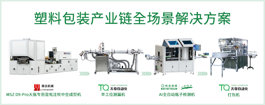 注吹中空成型機在使用過程中因受原料、環(huán)境干擾,成型產(chǎn)品存在孔洞、外觀缺陷。天奇自動化的測漏機利用真空衰減法對產(chǎn)品進行檢測,通過負壓將孔洞的產(chǎn)品進行剔除,而科億科技AI全自動瓶子檢測機則是對瓶子進行外觀缺陷檢測,如黑點、厚薄不均、臟污等,檢測后將不良品剔除,良品輸送到打包機打包封裝。